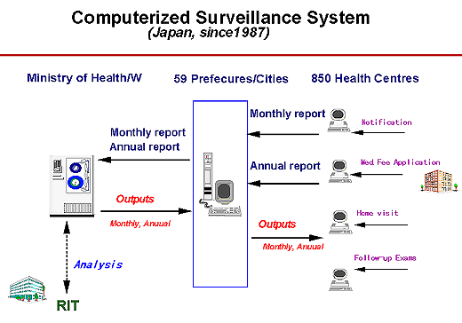 The computerized tuberculosis surveillance have been carried out since 1987 in Japan. The surveillance system consists of a three-phase structure, the health center level, the local government level, and the Ministry of Health and Welfare (MOHW). MOHW is technically strongly supported by the Research Institute of Tuberculosis (RIT), Japan Anti-Tuberculosis Association (JATA), as can be seen in Figure. As of 1994, there are 844 health centers, 47 prefectures and 12 Metropolitan Cities as local government in Japan.